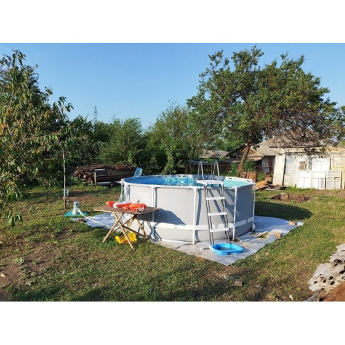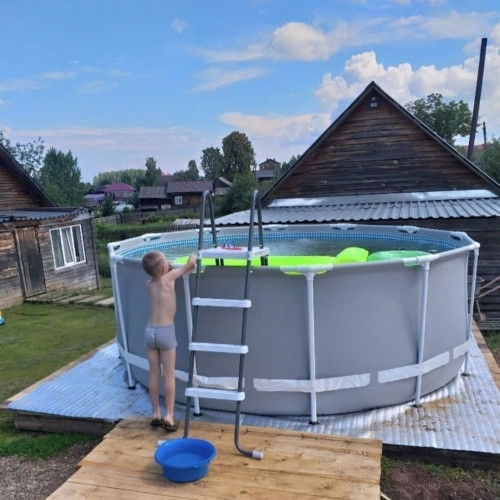 Бассейн очень устойчивый, дно плотное. Понравилось, что стальные трубы каркаса с порошковым покрытием — намека на ржавчину после дождей нет. Дети в восторге, места для плавания на кругах и матрасах предостаточно. Качество материалов на высоте, прослужит явно не один сезон